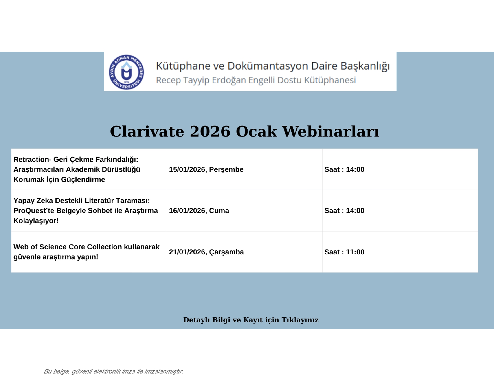 Kütüphane Eğitimleri kapsamında aşağıda belirtilen tarihlerde Web of Science ve Proquest webinarları düzenlenecektir.