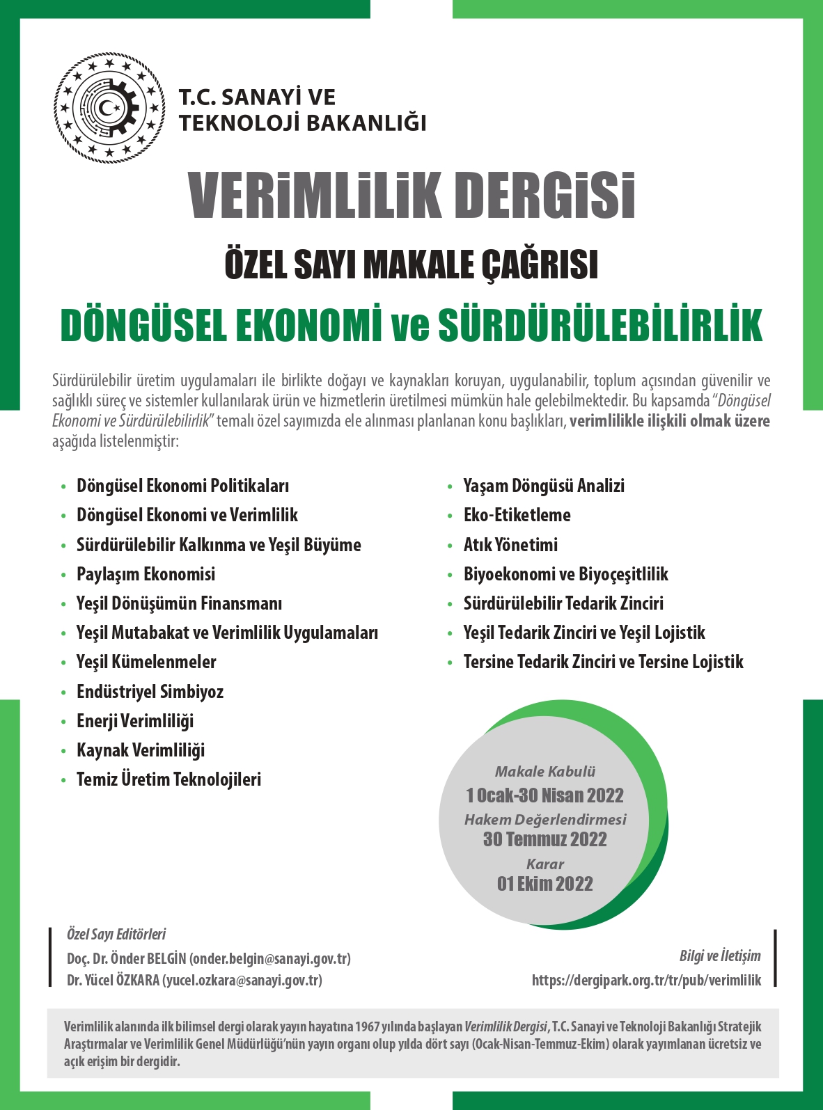 Sanayi ve Teknoloji Bakanlığından alınan; Verimlilik Dergisi'ne ek olarak "Döngüsel Ekonomi ve Sürdürülebilirlik" temalı bir özel sayı yayımlanacaktır. Araştırmacıların 30 Nisan 2022 tarihine kadar çalışmalarını iletmeleri gerekmektedir.