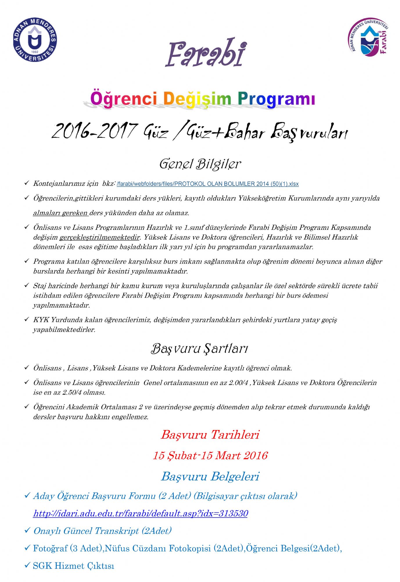 Farabi Değişim Programı 2016-2017 Eğitim-Öğretim Yılı Öğrenci Değişimi Başvuruları 15 Şubat-15 Mart 2016 tarihleri arasında yapılacaktır.