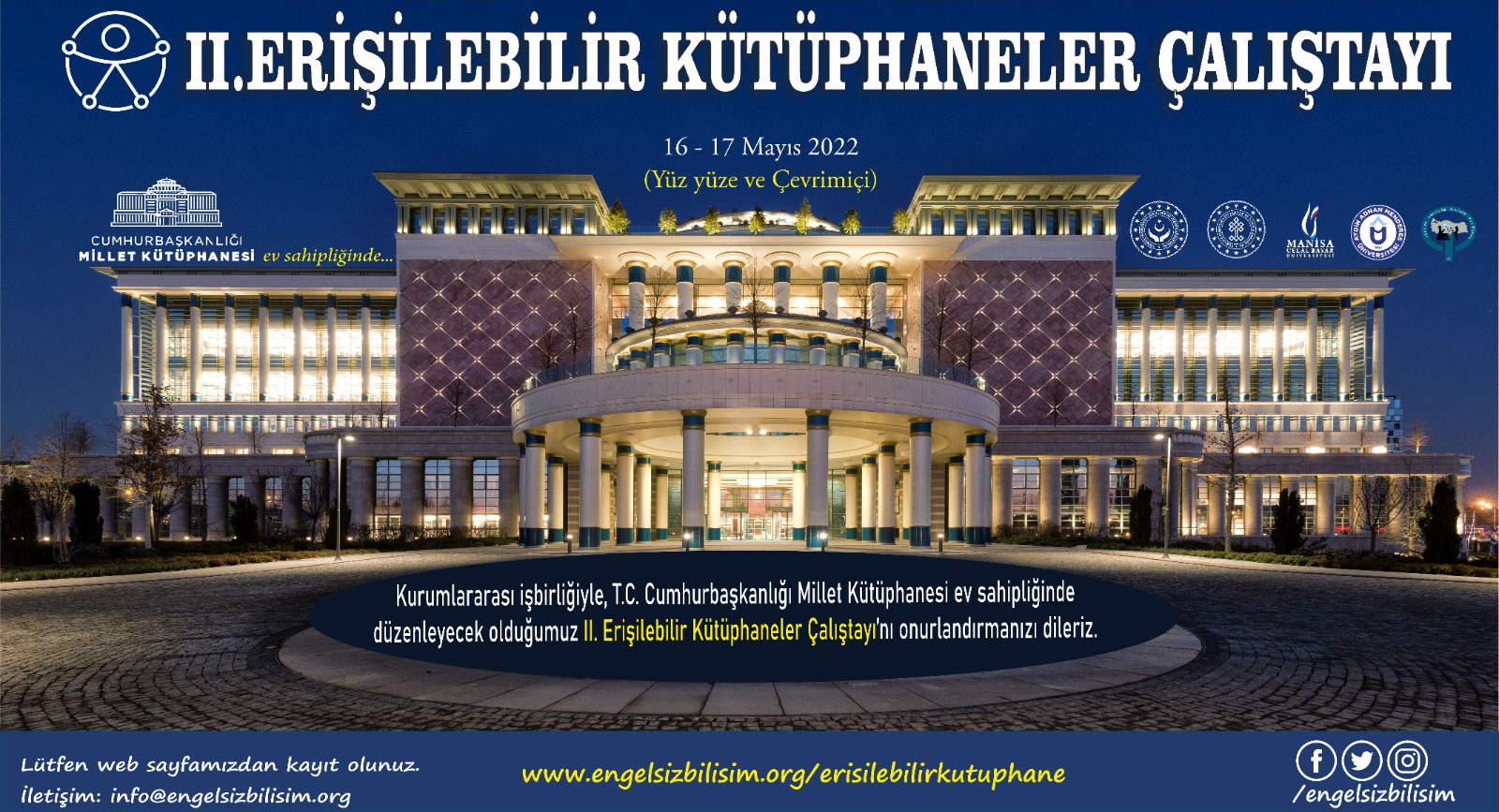 Üniversitemizin de hazırlanmasında paydaşı olduğu “II. Erişilebilir Kütüphaneler Çalıştayı”, Engelliler Haftası kapsamında 16-17 Mayıs 2022 tarihlerinde T.C. Cumhurbaşkanlığı Millet Kütüphanesi ev sahipliğinde gerçekleşecek. Çalıştay, Üniversitemizin yanı sıra Türkiye Cumhuriyeti Aile ve Sosyal Hizmetler Bakanlığı (ASHB) Engelli ve Yaşlı Hizmetleri Genel Müdürlüğü, Kültür Bakanlığı Kütüphaneler ve Yayımlar Genel Müdürlüğü, Manisa Celal Bayar Üniversitesi ve Türkiye Engelsiz Bilişim Platformu iş birliği ile düzenlenecek.