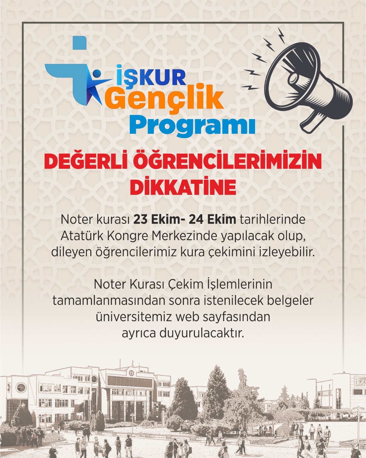 Noter kurası 23 Ekim- 24 Ekim 2025 tarihlerinde Atatürk Kongre Merkezinde yapılacak olup, dileyen öğrencilerimiz kura çekimini izleyebilir. Noter Kurası çekim İşlemlerinin tamamlanmasından sonra istenilecek belgeler üniversitemiz web sayfasından ayrıca duyurulacaktır.