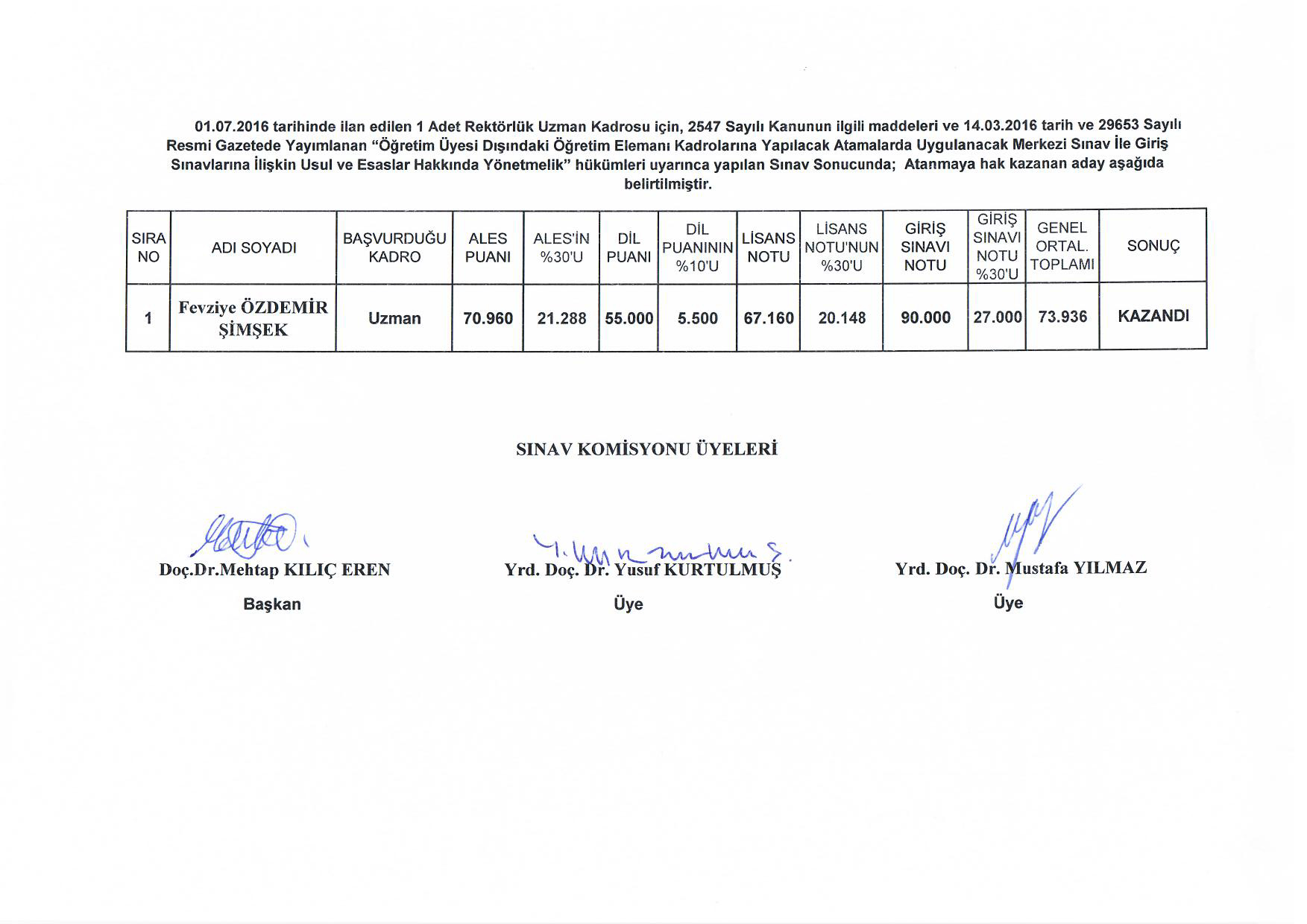 Rektörlük-Uzman Kadrosu için 01.08.2016 tarihinde yapılan Giriş Sınavı Sonuçları Açıklanmıştır