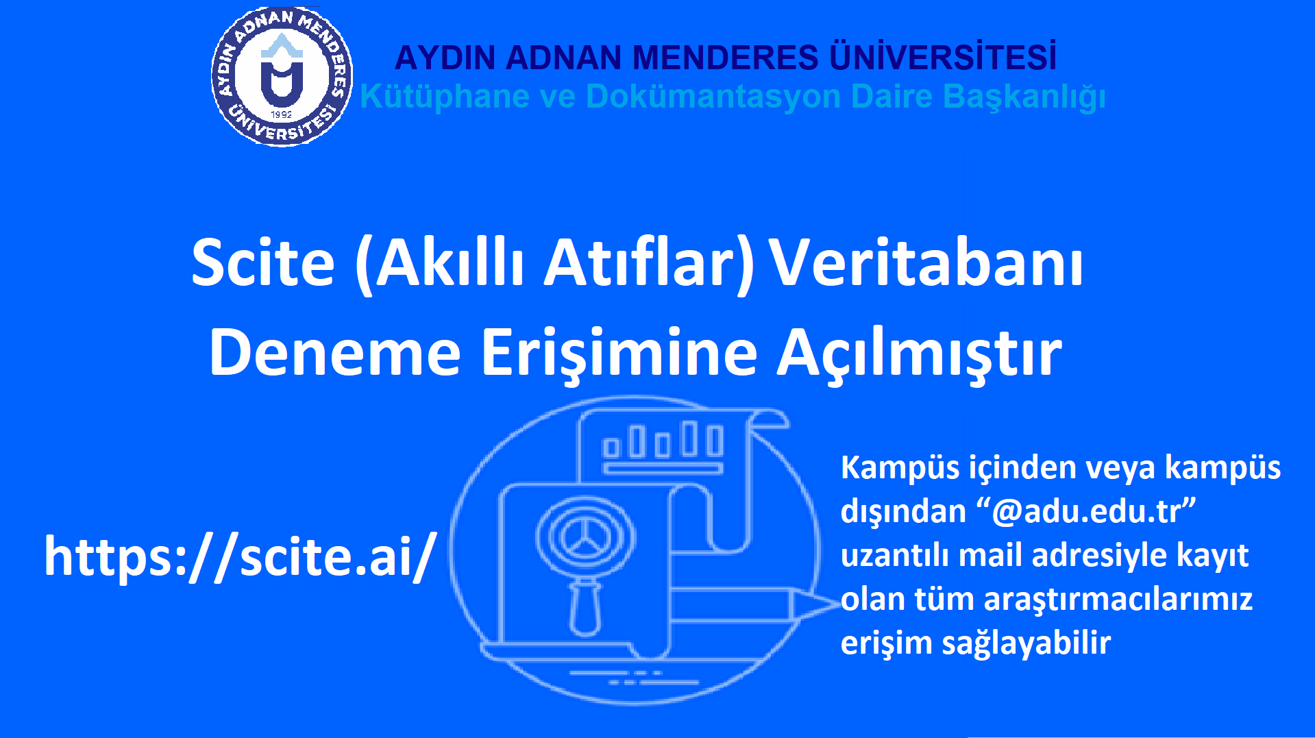 Scite (Akıllı Atıflar)Veritabanı: belirtilen tarihlere kadar kütüphanemiz kullanıcılarına deneme erişimine açılmıştır. Bu veri tabanına aşağıda yer alan linkten veya kütüphanemiz web sayfasında yer alan "deneme amaçlı veri tabanları" linkinden (https://kutuphane.adu.edu.tr/default.asp?idx=313930) ulaşabilirsiniz.