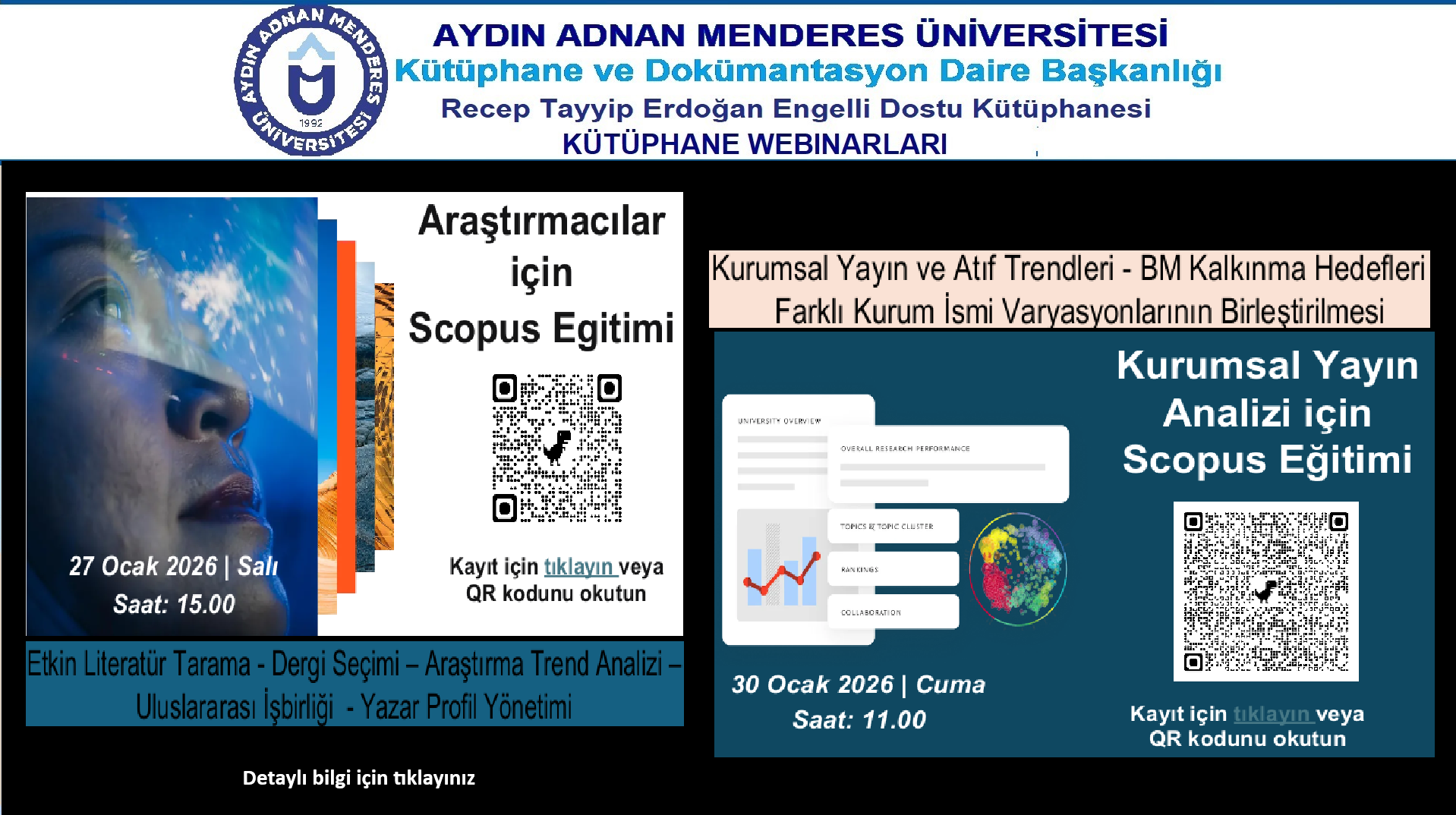 Kütüphane ve Dokümantasyon Daire BaşkanlığıRecep Tayyip Erdoğan Engelli Dostu KütüphanesiWeb: https://kutuphane.adu.edu.trE-posta: kutuph@adu.edu.trf: https://www.facebook.com/adukutuphanet:https://twitter.com/adukutuphane
