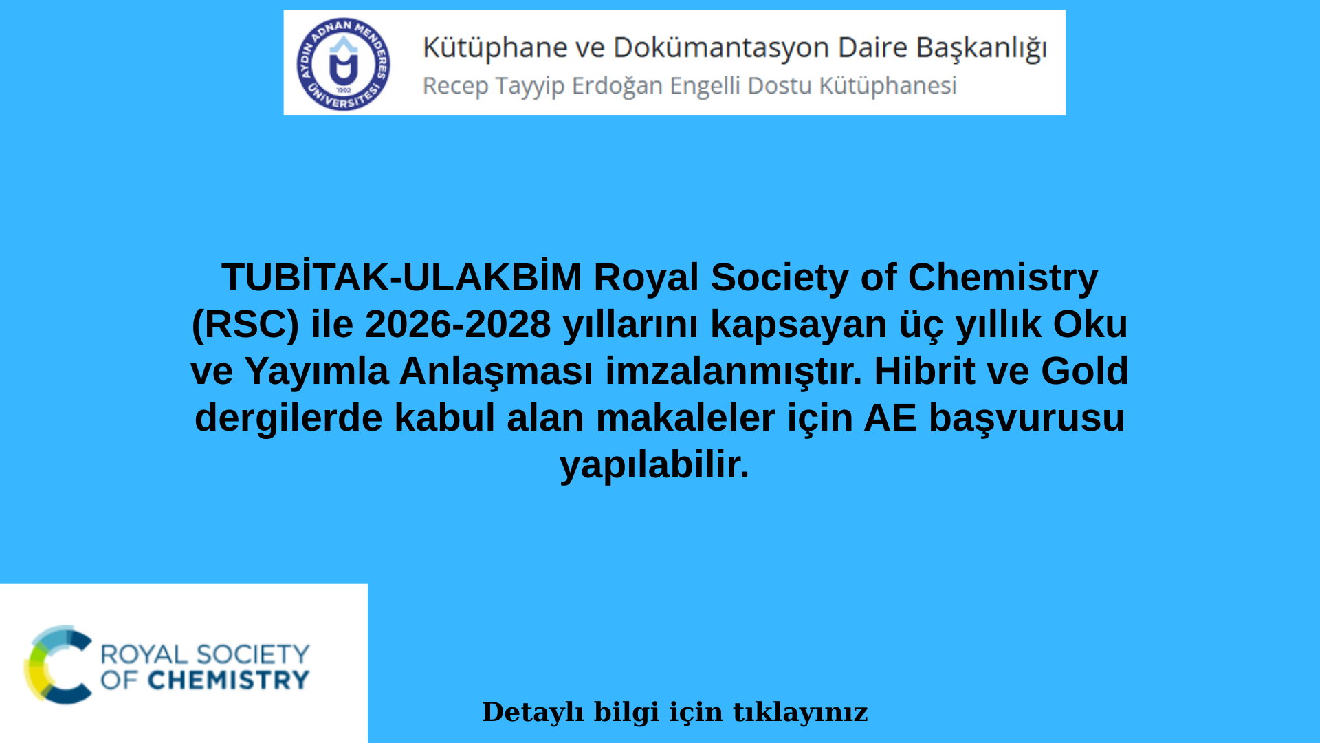 TUBİTAK-ULAKBİM Royal Society of Chemistry (RSC) ile 2026-2028 yıllarını kapsayan üç yıllık Oku ve Yayımla Anlaşması imzalanmıştır. Hibrit ve Gold dergilerde kabul alan makaleler için AE başvurusu yapılabilir.