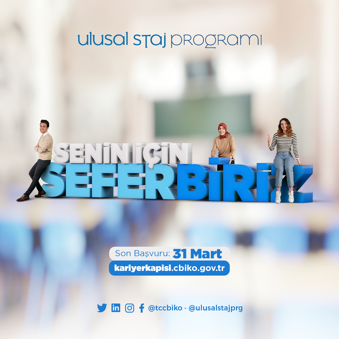 Gençlerimizi kamu kurumları ve gönüllü özel sektör kuruluşları ile buluşturan #UlusalStajProgramı başvuruları devam ediyor! #SeninİçinSeferbiriz @tccbiko @ulusalstajprg Son Başvuru Tarihi: 31 Mart 2022 Başvuru Adresi: http://kariyerkapisi.cbiko.gov.tr