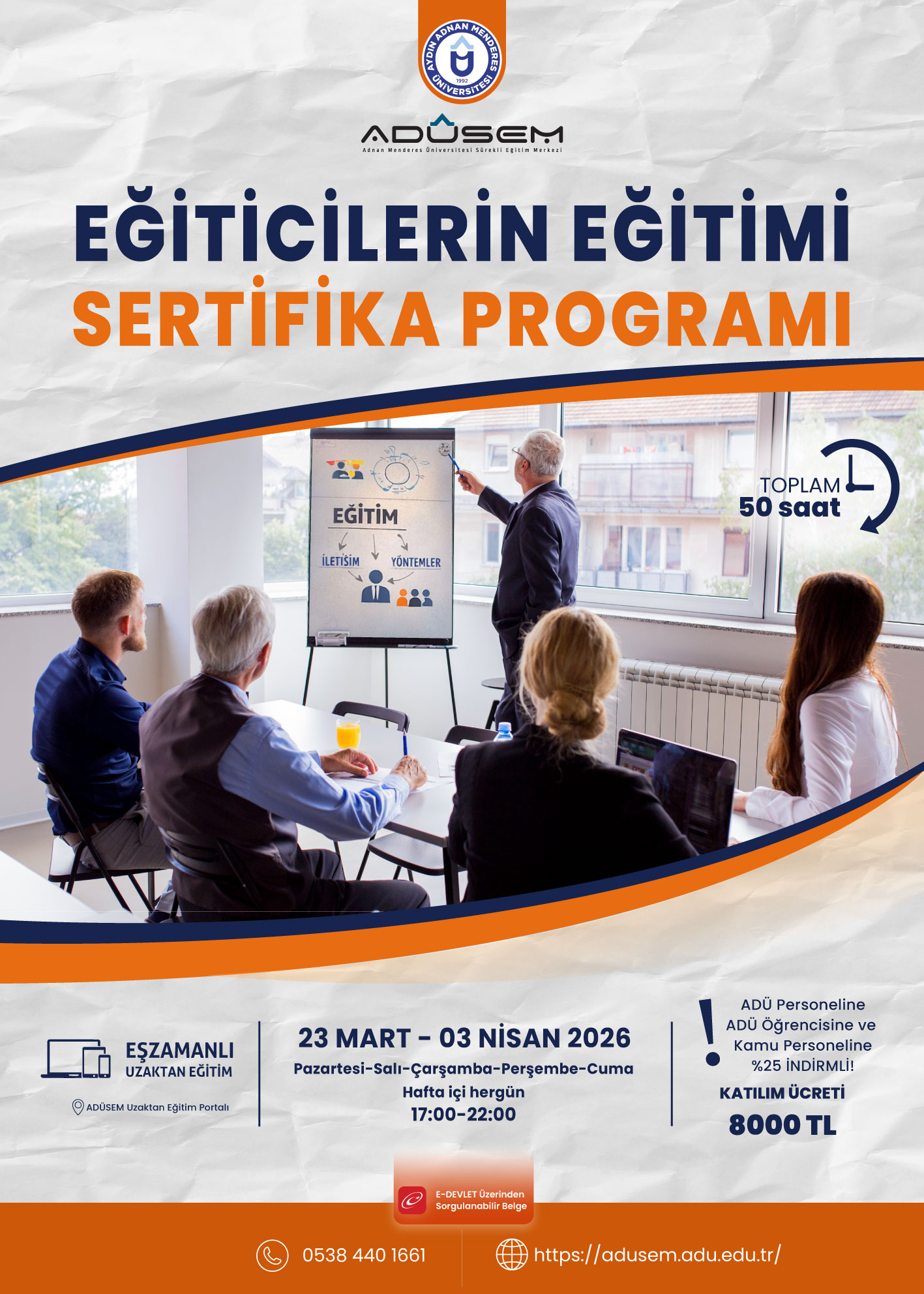 Eğitim, 23 Mart 2026 ile 03 Nisan 2026 tarihleri arasında https://adusem.adu.edu.tr/? üzerinden gerçekleşecektir.