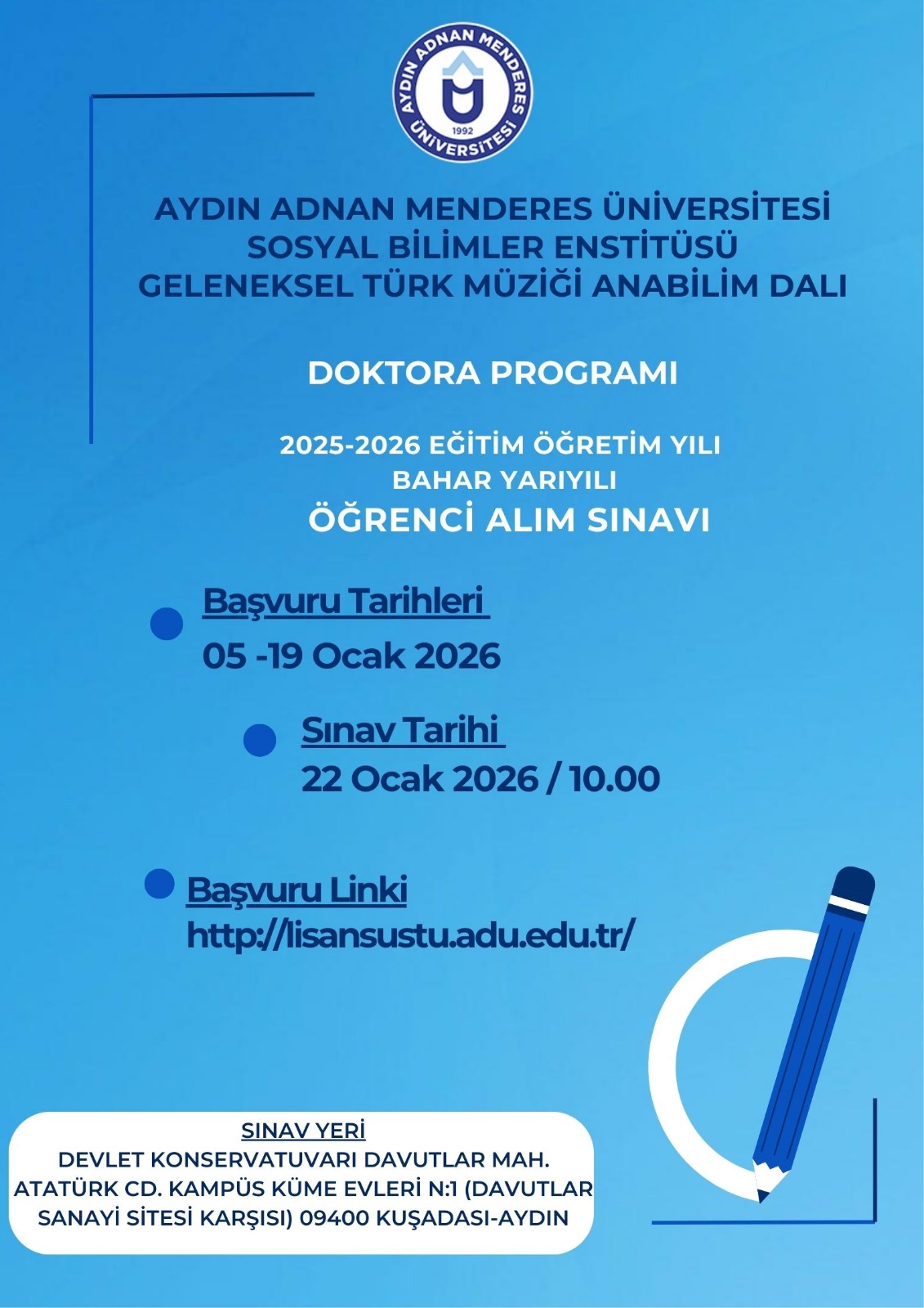 Sınav, 22 Ocak 2026 tarihinde Devlet Konservatuvarı Davutlar Mah. Atatürk Cad. Kampüs Küme Evleri No:1 Kuşadası / Davutlar'da gerçekleşecektir.