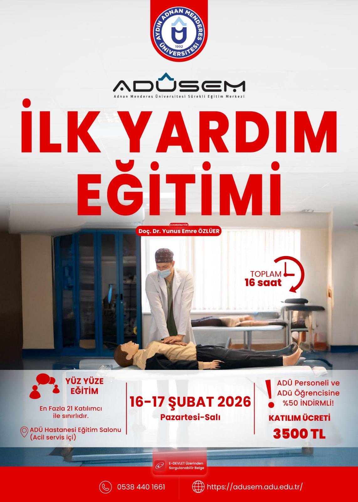 Eğitim 17-18 Şubat 2026 tarihleri arasında Adü Hastanesi Eğitim Salonu (Acil Servis İçi) gerçekleştirilecektir.