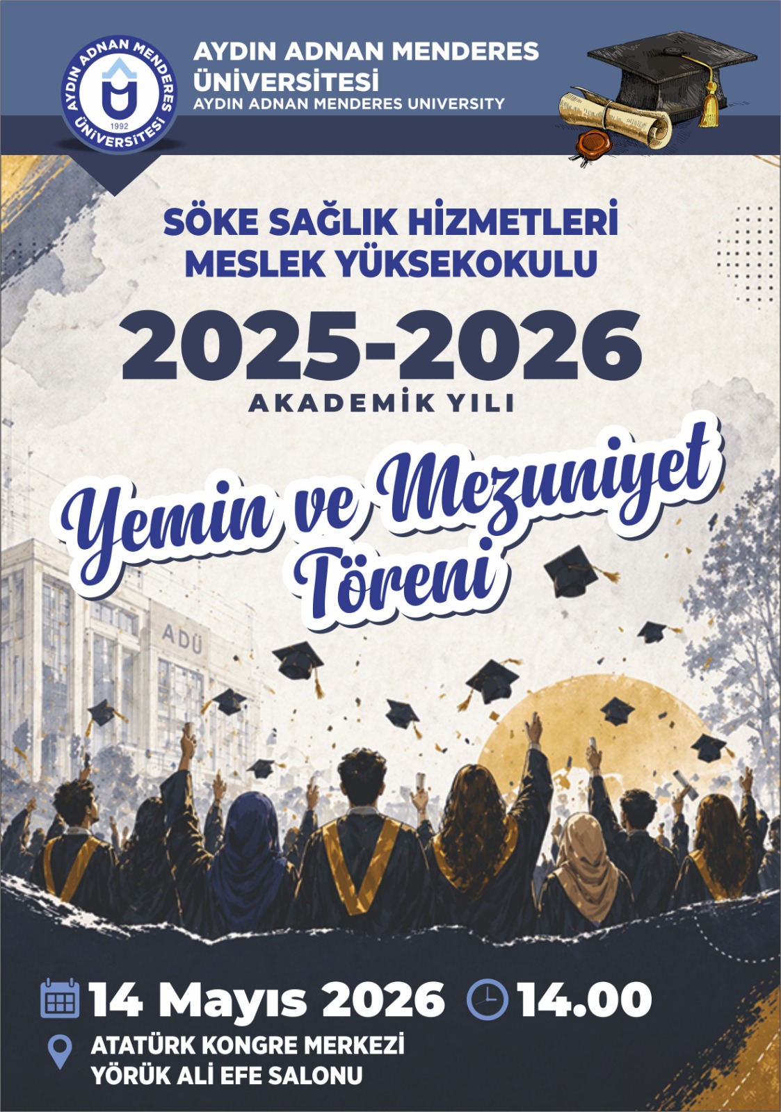 Mezuniyet Töreni, 14 Mayıs 2026 tarihinde Atatürk Kongre Merkezi Yörük Ali Efe Salon'unda gerçekleştirilecektir.