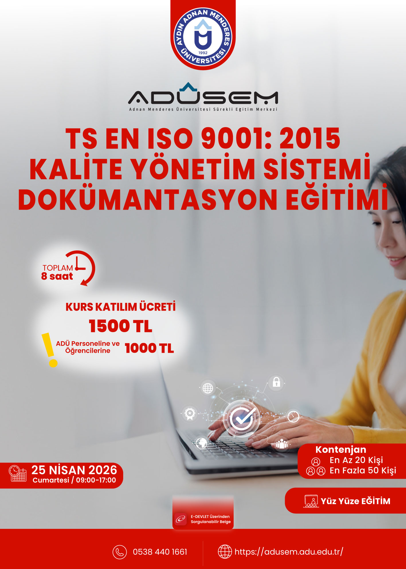 Eğitim, 25 Nisan 2026 tarihinde https://adusem.adu.edu.tr/ üzerinden gerçekleştirilecektir.
