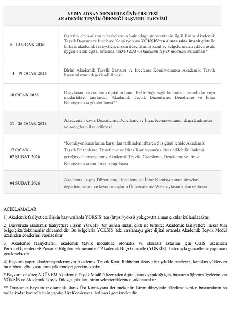 Akademik teşvik başvurularına ilişkin takvim belirlenmiş olup, öğretim elemanlarımızın başvurularını 5–13 Ocak 2026 tarihleri arasında; YÖKSİS üzerinden alınan ıslak imzalı başvuru çıktıları ile akademik faaliyetlere ilişkin kanıt belgelerini, usul ve esaslara uygun şekilde dijital ortamda sisteme yükleyerek tamamlamaları gerekiyor.