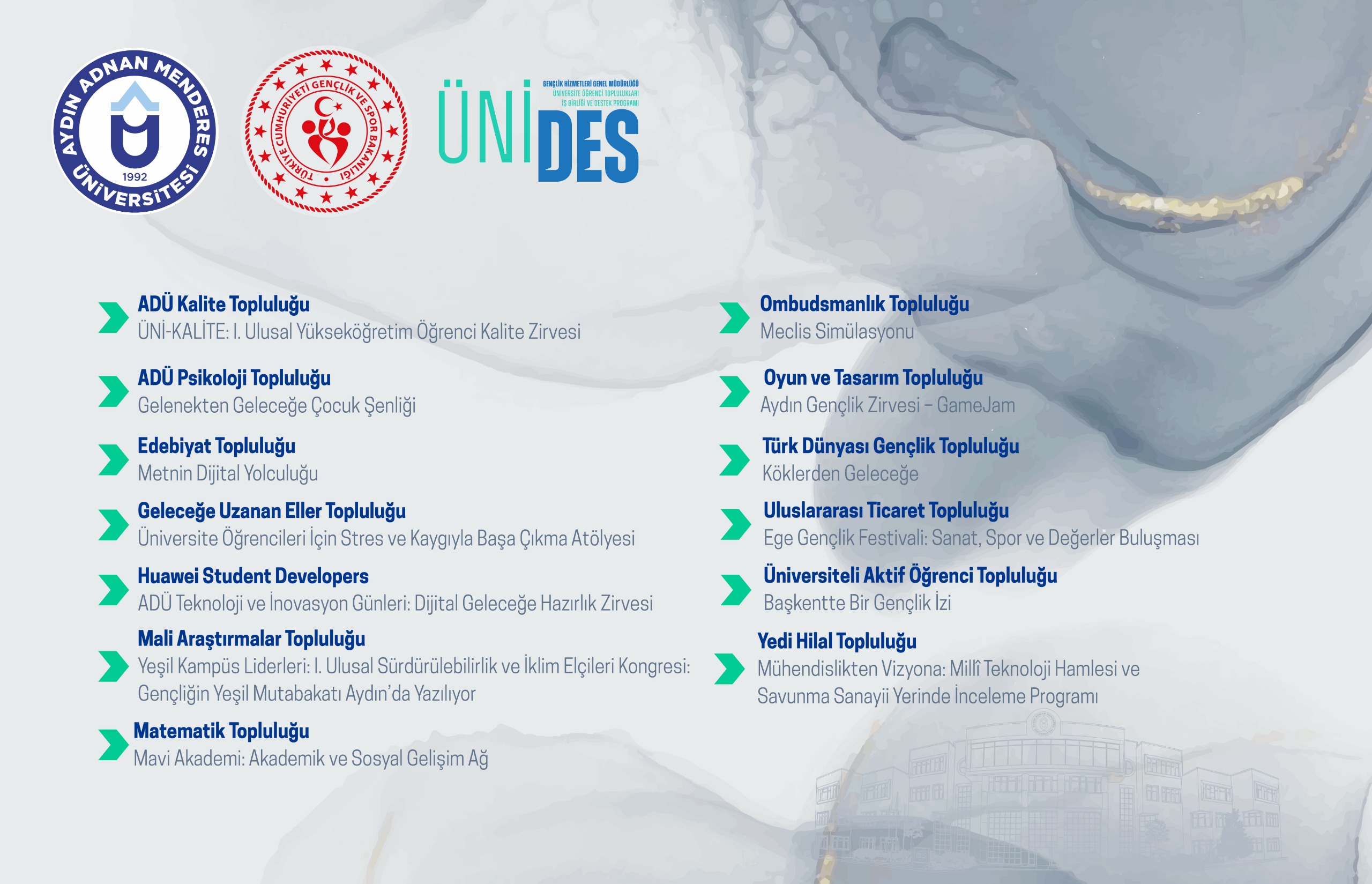 ÜNİDES Kapsamında Destek Almaya Hak Kazanan Projeler:• ÜNİ-KALİTE: I. Ulusal Yükseköğretim Öğrenci Kalite Zirvesi – ADÜ Kalite Topluluğu