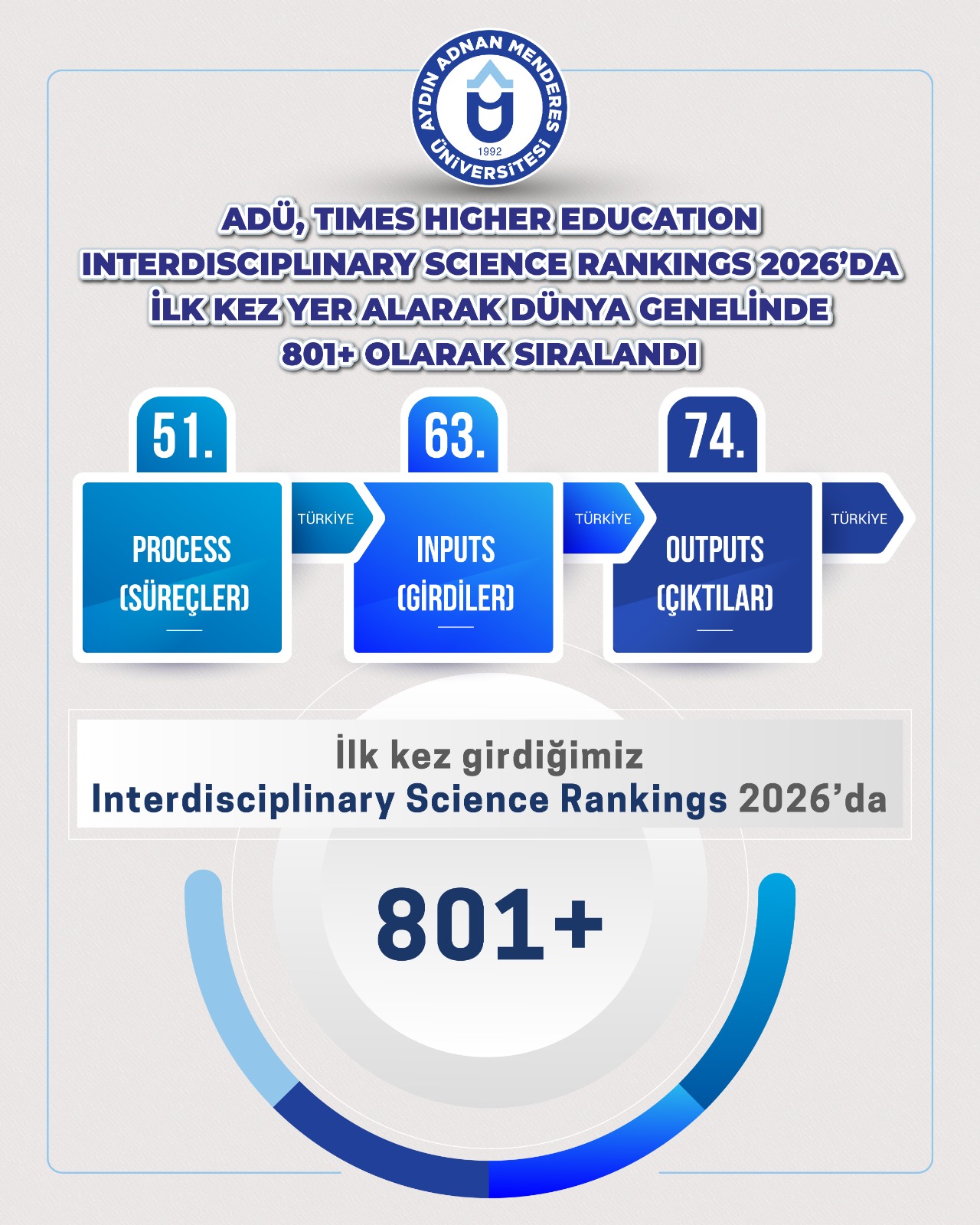 2026 yılı sonuçlarına göre Türkiye’den toplam 93 üniversitenin dâhil edildiği sıralamada ADÜ, bu yıl ilk kez veri setine girerek bilimsel altyapısı, süreç yönetimi ve akademik performansı üzerinden değerlendirildi. Üniversitemiz, Inputs kategorisinde Türkiye genelinde 63., Process kategorisinde 51. ve Outputs kategorisinde 74. sırada yer aldı. Bu sonuçlar, Aydın Adnan Menderes Üniversitesinin araştırma süreçlerinin ulusal ölçekte rekabetçi bir seviyeye ulaştığını gösteriyor.