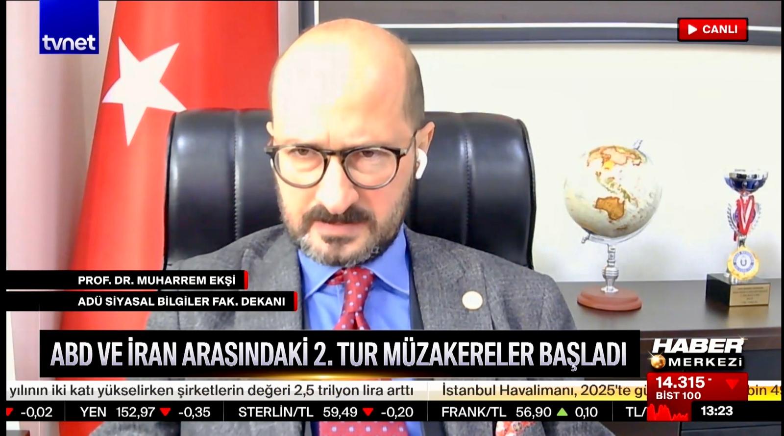 Prof. Dr. Muharrem Ekşi, bölgesel ve küresel gelişmelere ilişkin değerlendirmelerde bulunmak üzere TRT Arapça ve TVNET ekranlarında yayımlanan programlara konuk oldu. Gerçekleştirilen yayınlarda, bölgesel ve küresel düzeyde yaşanan güncel gelişmeler ele alınırken, devam eden müzakere sürecinin olası etkileri siyasi, ekonomik ve diplomatik boyutlarıyla genel çerçevede değerlendirildi. Prof. Dr. Ekşi sürecin uluslararası dengeler üzerindeki yansımalarına ilişkin kapsamlı analizler paylaşarak kamuoyunu bilgilendirdi.