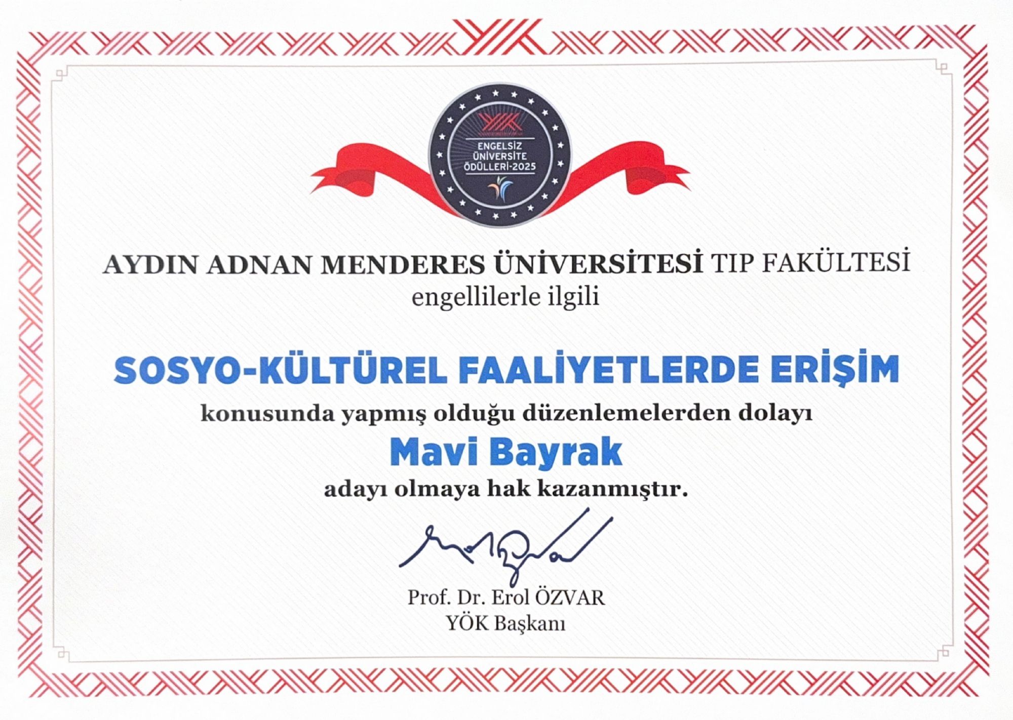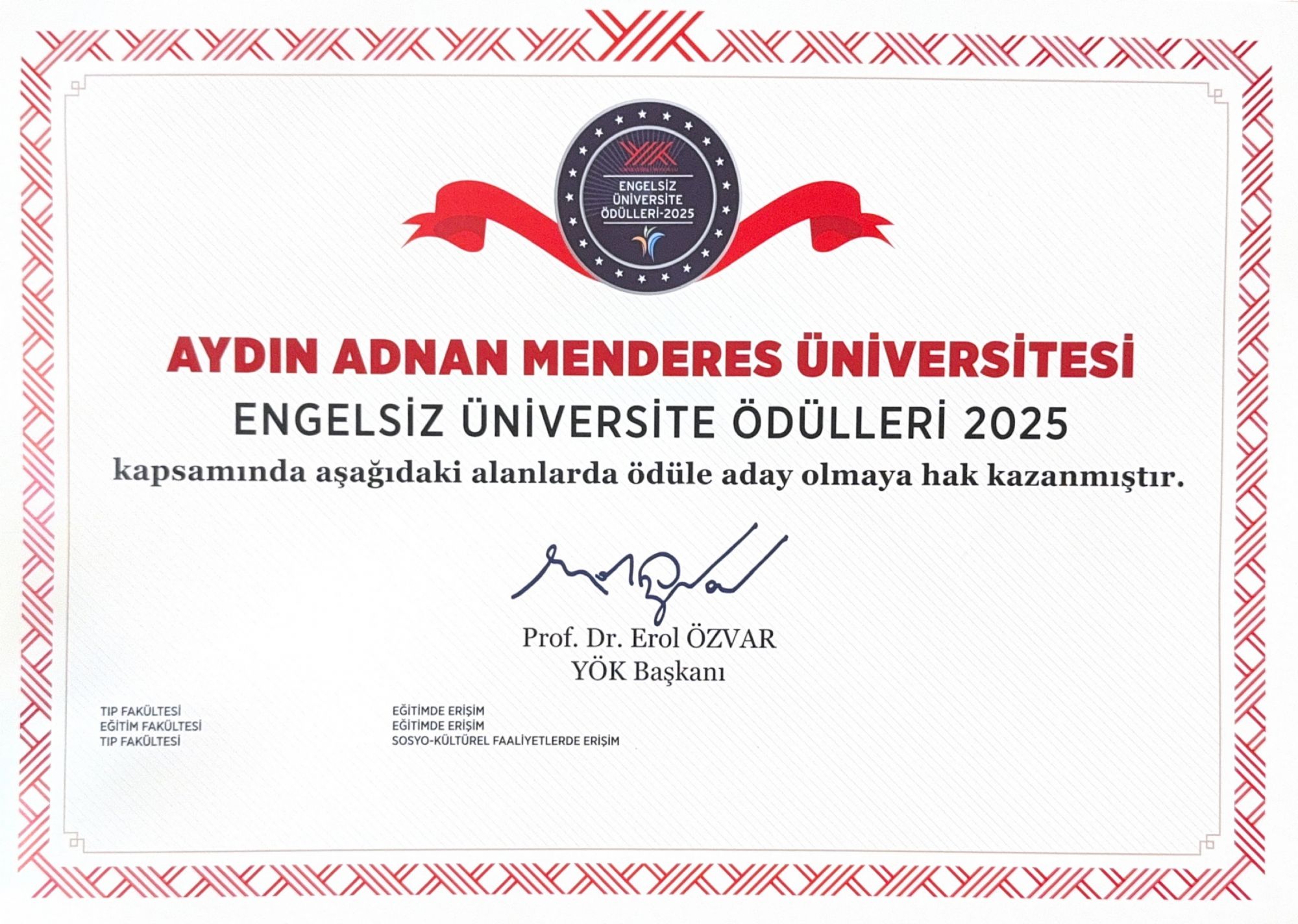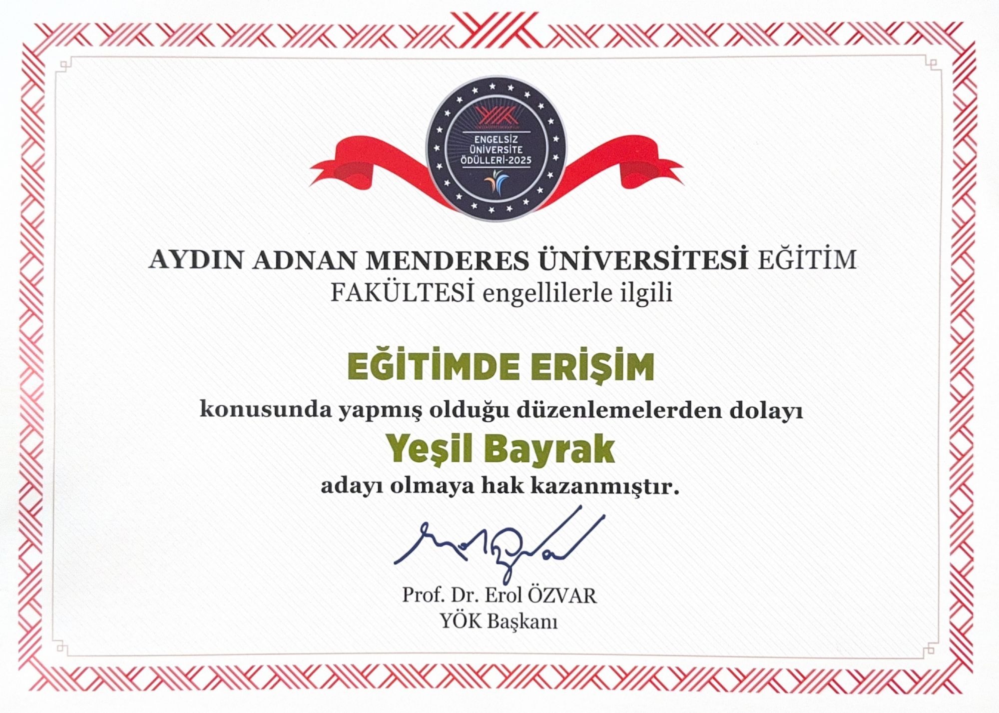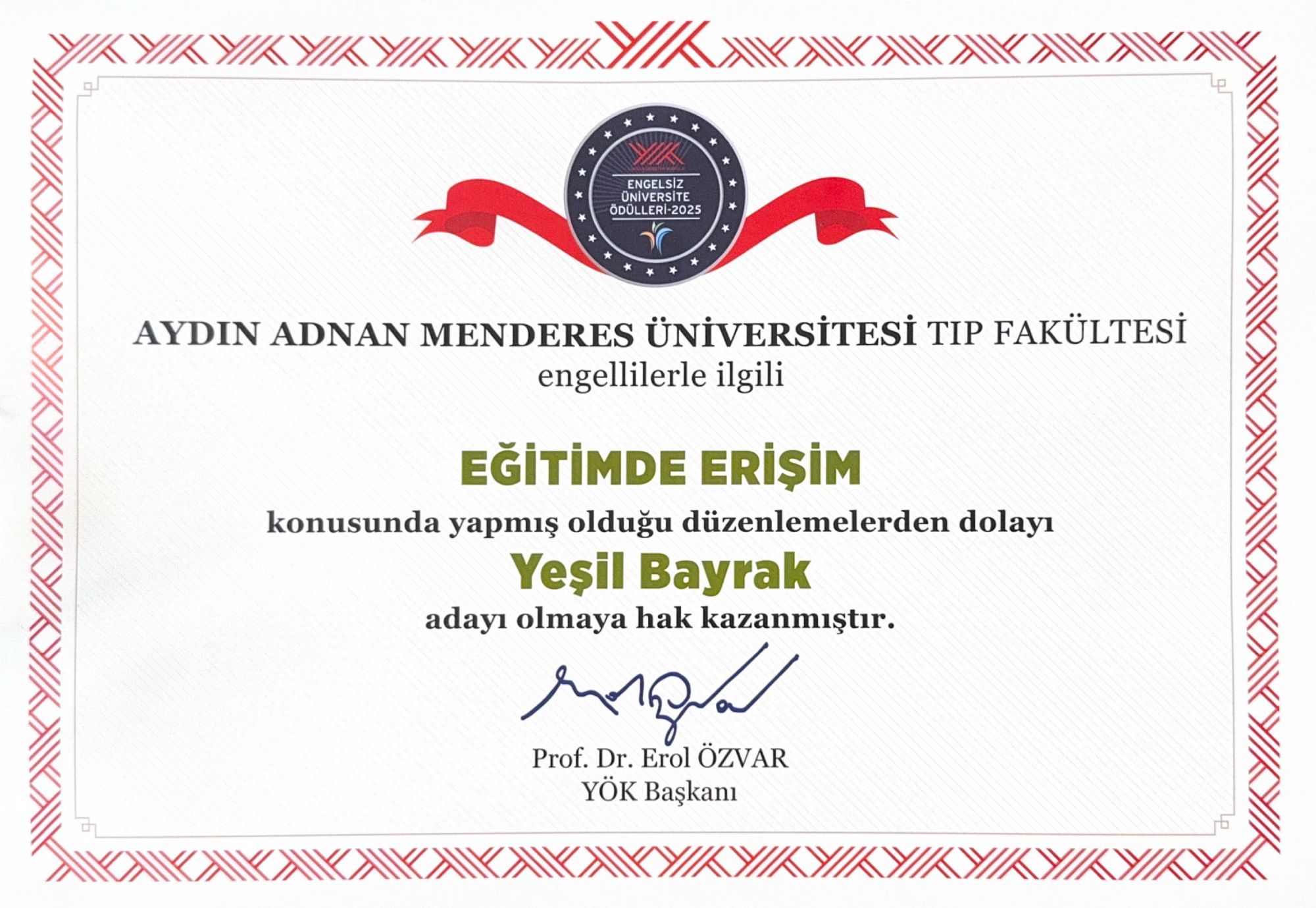 Üniversitemiz, “Engelsiz Üniversite” vizyonu doğrultusunda hayata geçirdiği uygulamalar ve erişilebilirlik odaklı iyileştirmelerle söz konusu kategorilerde öne çıktı. Tıp Fakültesi, engelli bireylerin eğitim süreçlerine erişimini kolaylaştırmaya yönelik yaptığı düzenlemeler kapsamında “Eğitimde Erişim” kategorisinde “Yeşil Bayrak”, “Sosyo-Kültürel Faaliyetlerde Erişim” kategorisinde ise “Mavi Bayrak” adayı oldu. Eğitim Fakültesi ise gerçekleştirdiği erişilebilirlik çalışmalarıyla “Eğitimde Erişim” kategorisinde “Yeşil Bayrak” adaylığı kazandı.