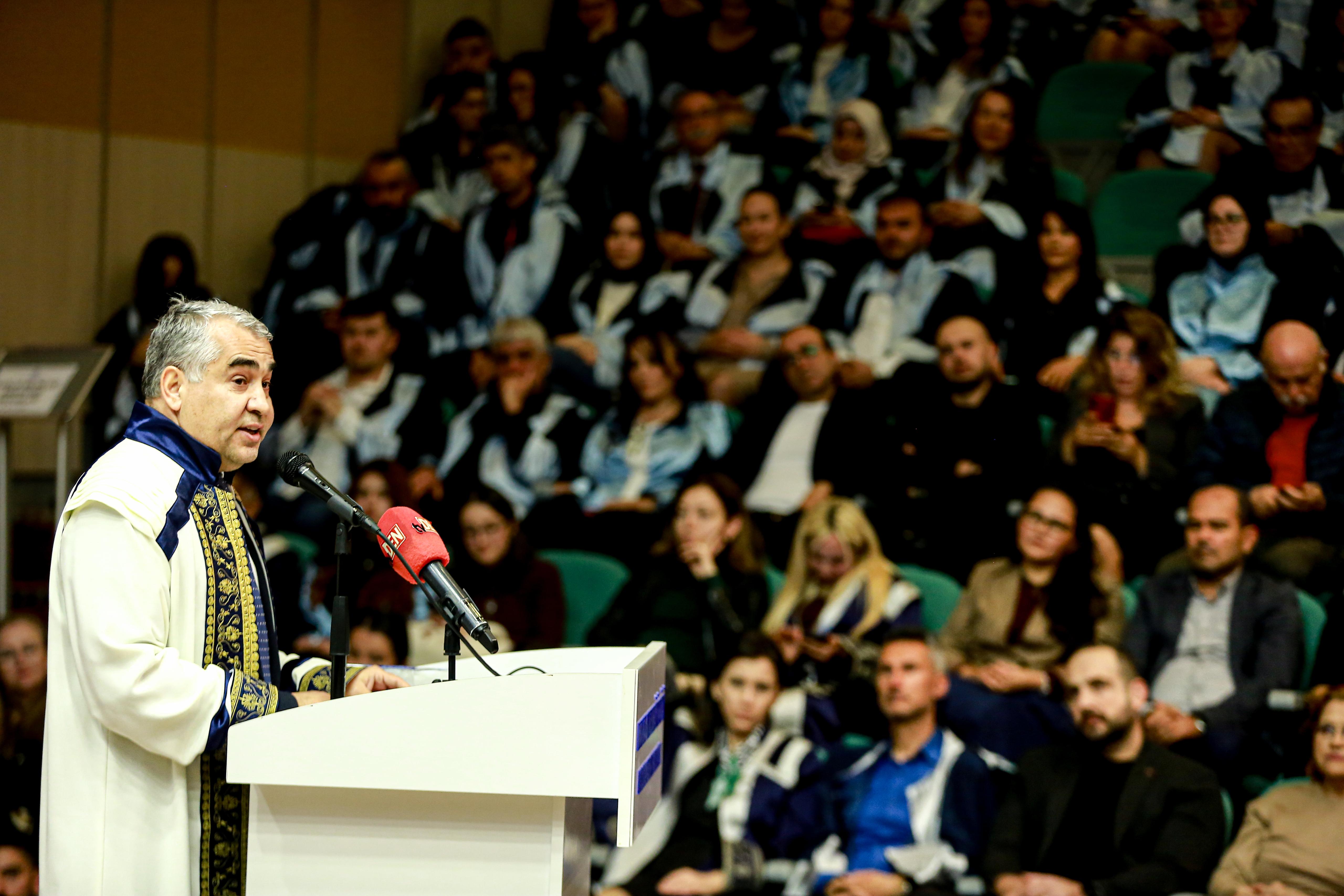 Rektörümüz Prof. Dr. Bülent Kent konuşmasında lisansüstü eğitimin, bireyleri alanlarında uzmanlaştırmasının yanı sıra sabır, kararlılık, bilimsel etik ve çalışma disiplininin kazandırılmasında büyük rol oynadığını vurgulayarak “Bugün mezun ettiğimiz her bir öğrencimiz artık sadece bir diploma sahibi değil; bilginin derinliğine inmiş, analitik düşünceyi benimsemiş, bilimsel araştırma kültürünü sorumlulukla taşıyan bireylerdir. Üniversitemizin üç güçlü lisansüstü enstitüsü, köklü bir bilimsel birikimin temsilcileridir.” dedi.